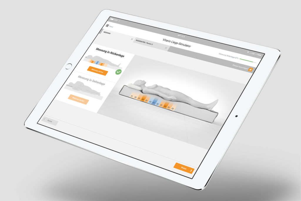 Danach errechnet der Liege-Simulator einen Stützvorschlag für Matratze und Kopfkissen. Dieser wird simuliert und liege-orthopädisch überprüft.